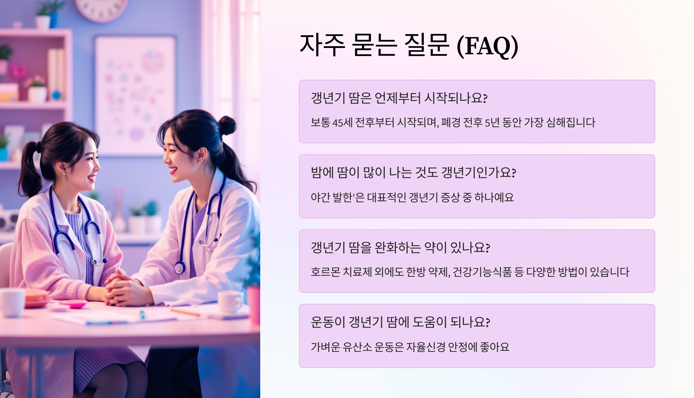 땀과 함께 찾아오는 갱년기 증상에 너무 힘들어하지 마시고, 오늘 알려드린 관리 방법들을 꾸준히 실천하여 건강한 중년 이후의 삶을 준비하시기 바랍니다.